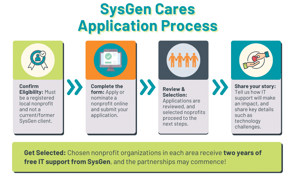 Since 2015, the SysGen Cares program has helped local nonprofits thrive by offering two years of free IT support. We’re passionate about strengthening communities and empowering organizations with the technology and solutions they need to succeed.